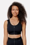 Rozepnij zamek i znajdujące się pod nim haftki. Załóż wyrób, przekładając ręce przez dedykowane otwory, obejmując klatkę piersiową tak, aby zapięcia na haftki i zamek znajdowały się z przodu. Zapnij haftki, a następnie zamek. Naciągnij wyrób w dół chwytając za dolną taśmę wykończeniową. Wyreguluj ramiączka.